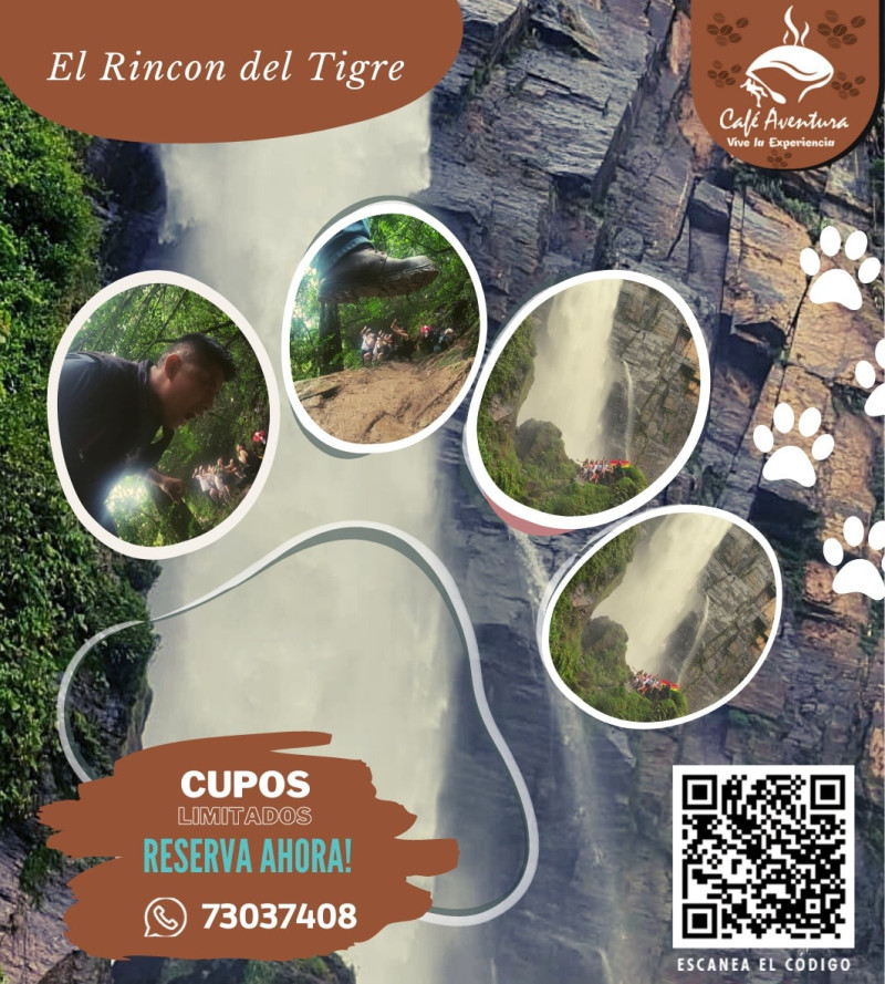 Caranavi cuenta con distintas cascadas en medio de la naturaleza, el Rincon del Tigre es la cascada mas impresionante y majestuos donde prácticamente quedaras empapado de su refrescante agua experimentando una paz única con su sonido relajante, la caminata desde la carreteraprincipal es de 10 minutos, podras visitar los tres miradores y visitando el pie de la cascada para sumergirte dentro de ella, el guía es conocedor de la naturaleza que compartirá cada detalle con los turistas. El viaje dura 1,45 horas desde la ciudad de Caranavi pasando por el Canton de Taipiplaya. El tour dura 6 hora.